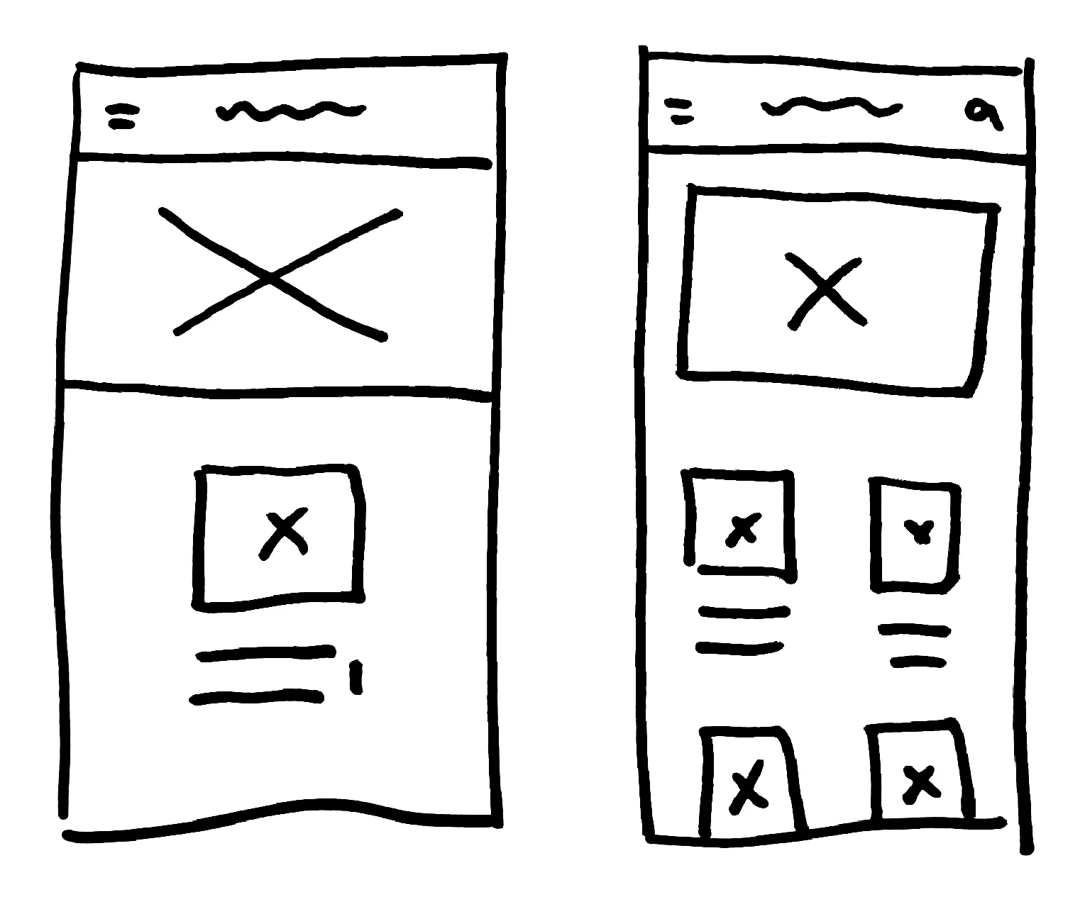 My next step was creating rough wireframes. I started by making quick sketches of two different basic layout ideas for displaying the products. Since this was my first time working on an e-commerce app, I spent more ideation on the shop layout. Once I have some basic sketches, I create digital wireframes with shapes for a clean iteration. These wireframes are the foundation for the interface.